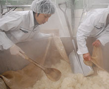 まずお米を蒸します。蒸した後、勇心酒造独自の技術でお米のエキスを抽出します。
